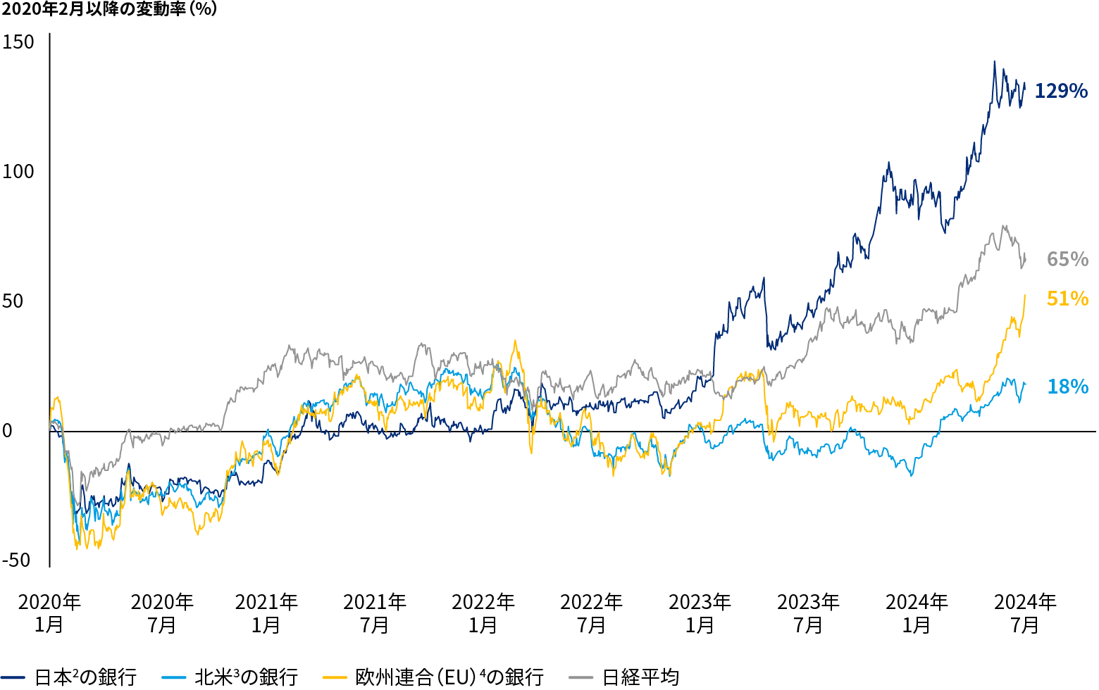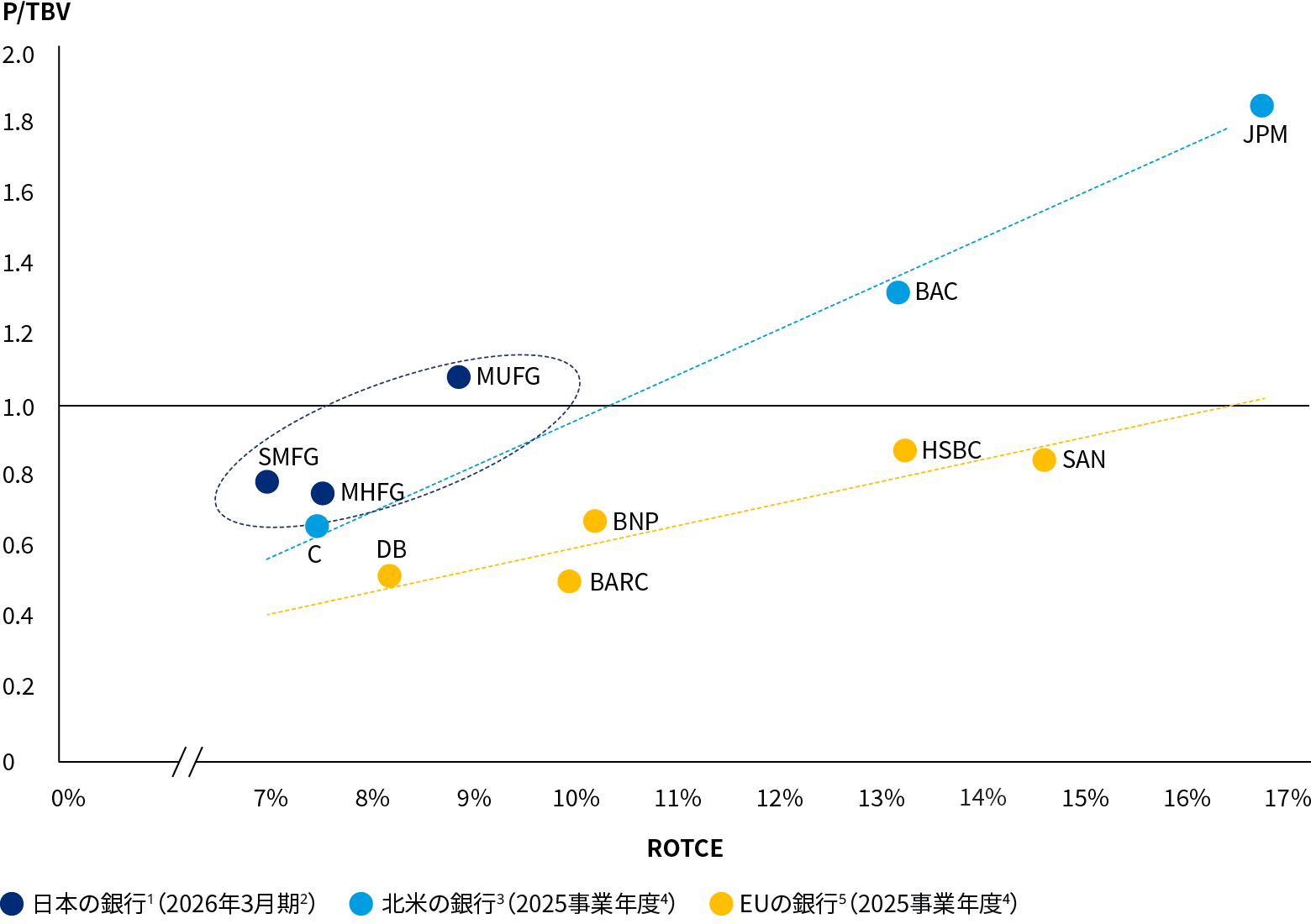 「メガバンクの奇跡」に対する投資家の懐疑的な見方は、いまなお消えておらず、それは直近の株価の急激な下落に裏付けられています。市場において最も楽観的な場合でも、メガバンクの株価は北米の同業他社に対して大幅なディスカウント水準で取引されています。世界の投資家は、株式の再評価に値する構造変化の証拠を求めています。