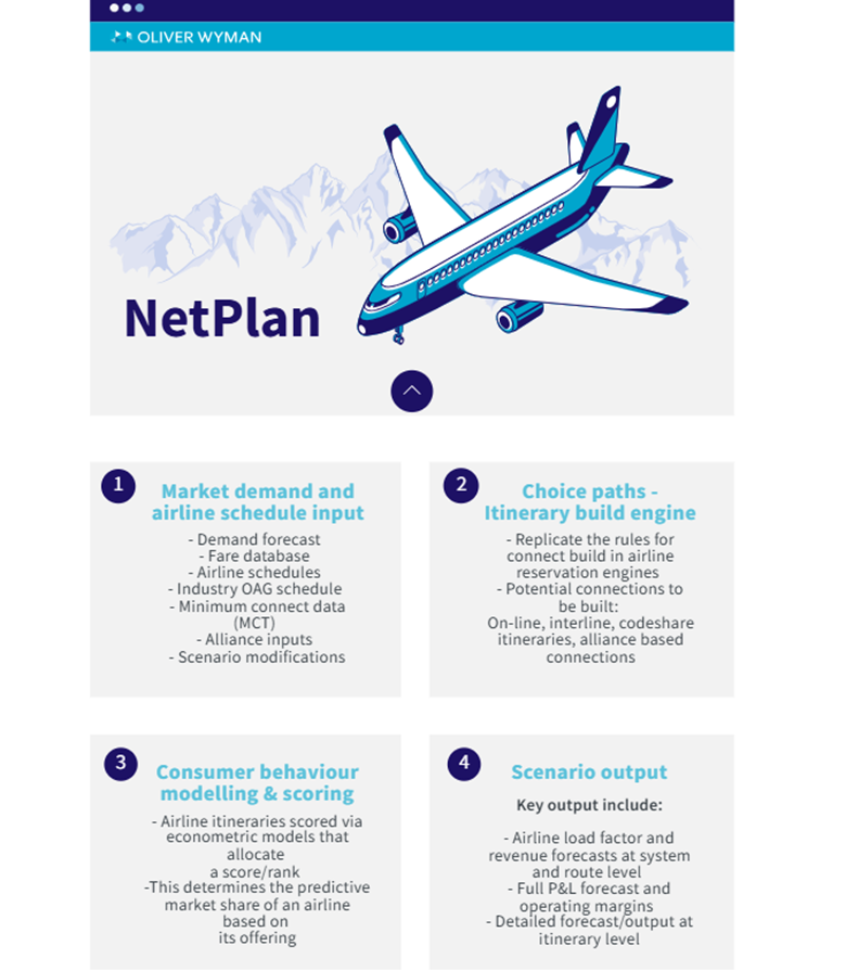Oliver Wyman has developed a suite of tools that enable strategy simulations across critical network-based decision-making topics to optimize choices. Our proprietary network planning model NetPlan is an integral part of it. For network planning, our tool leverages Quality of Service Index (QSI) based econometric processing that allows airlines to easily simulate new route launches and hubbing strategies to optimize existing networks.