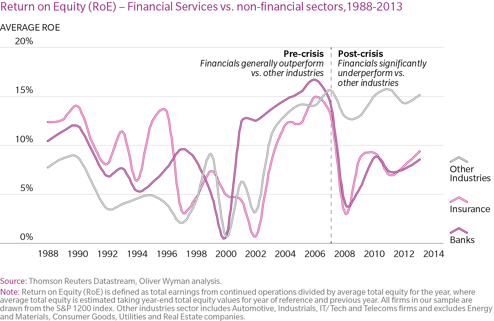 - Average returns of large financial firms have fallen from over 20% in the early 2000s to 7% in 2013, the level of utilities companies