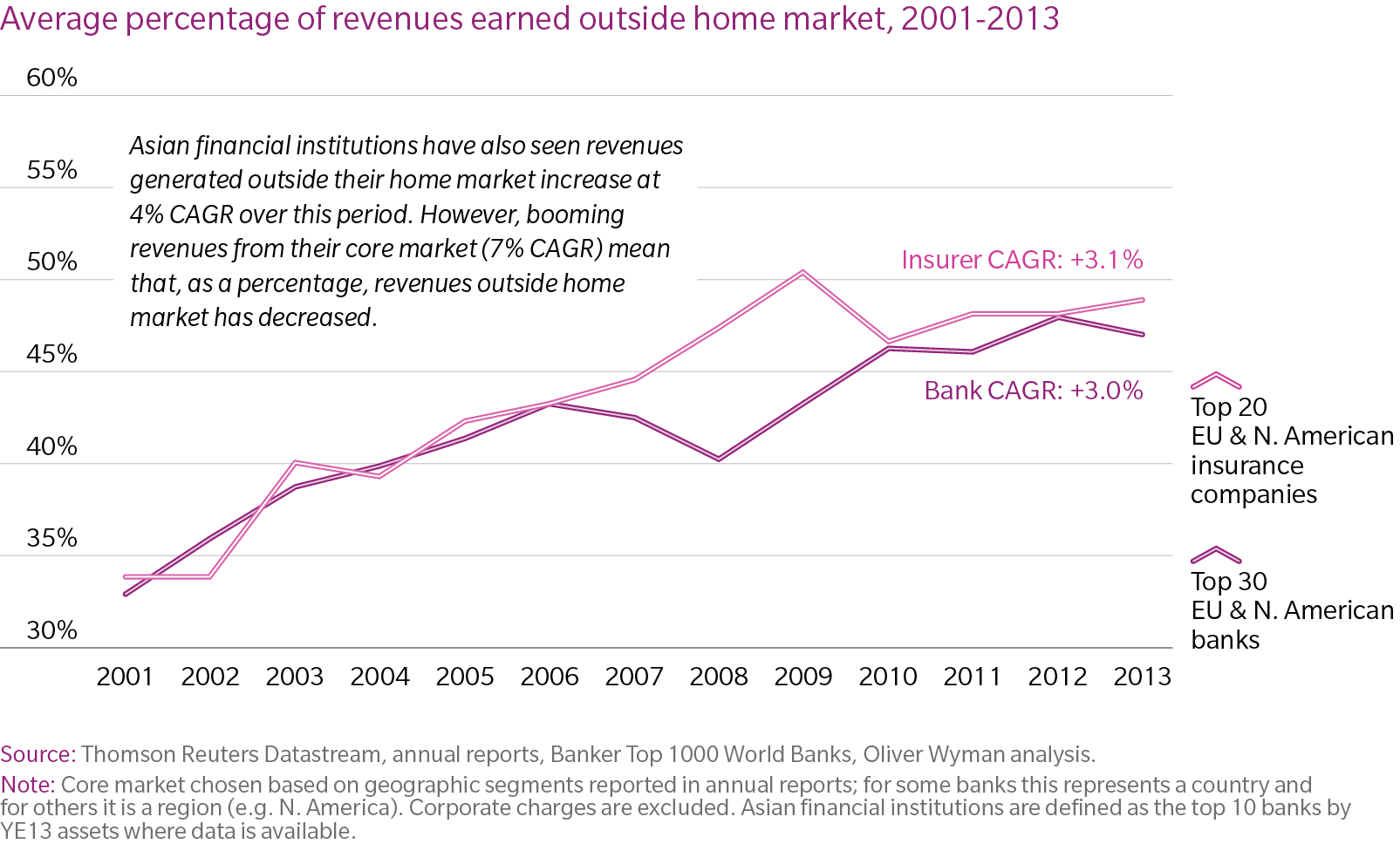 - Oliver Wyman estimates that between 2 .5% and 3.5% of North American, European and Australian financial institutions’ total costs come from meeting the elaborate new regulatory guidelines, that equates to US$0.7-1.5 BN per annum for the coming 2-3 years for large financial firms