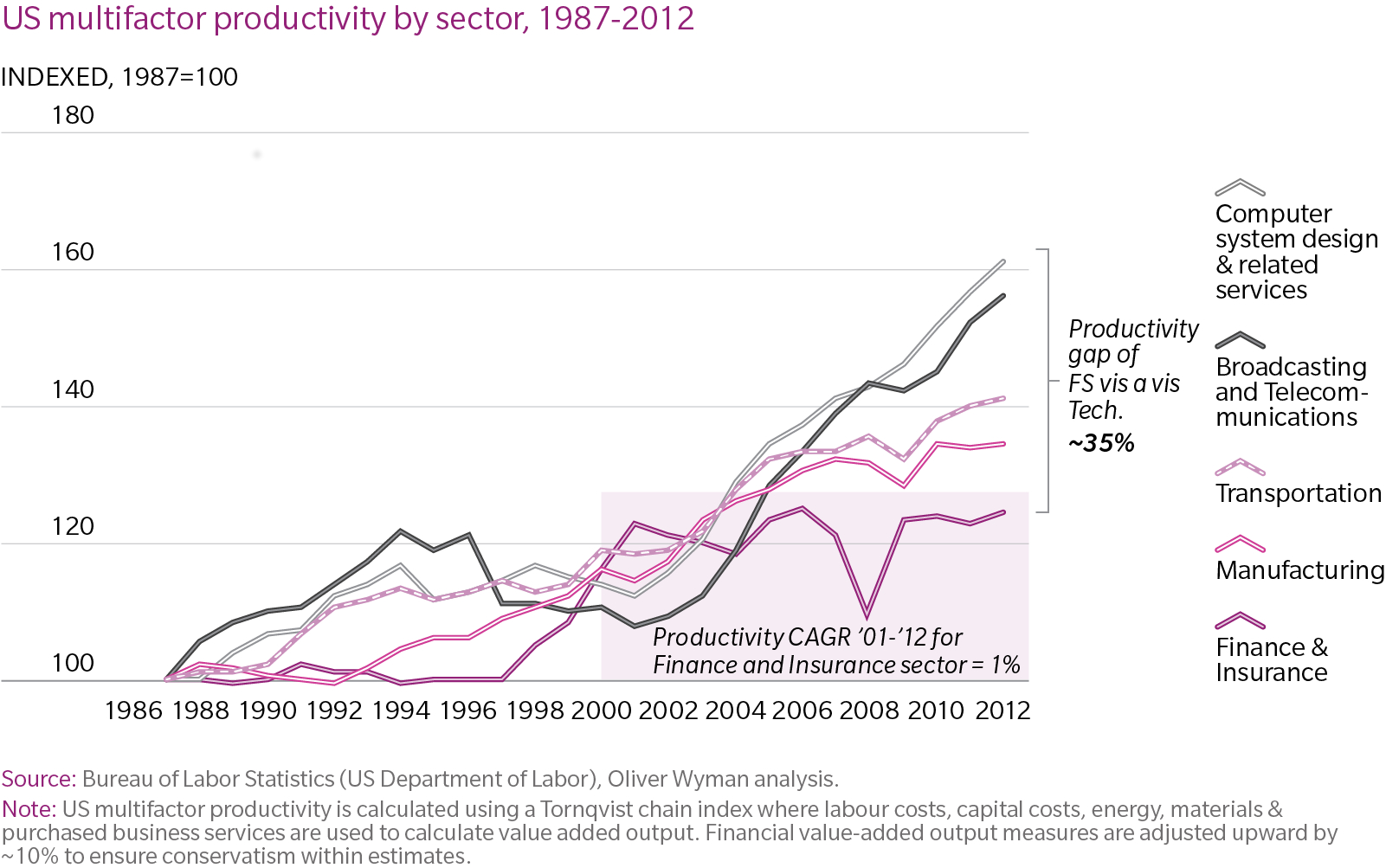 This increased their revenues. But their costs increased at the same rate. Although absolute profits grew, the productivity of financial sector firms has not improved since 2001. And, as we now know, risk grew too.