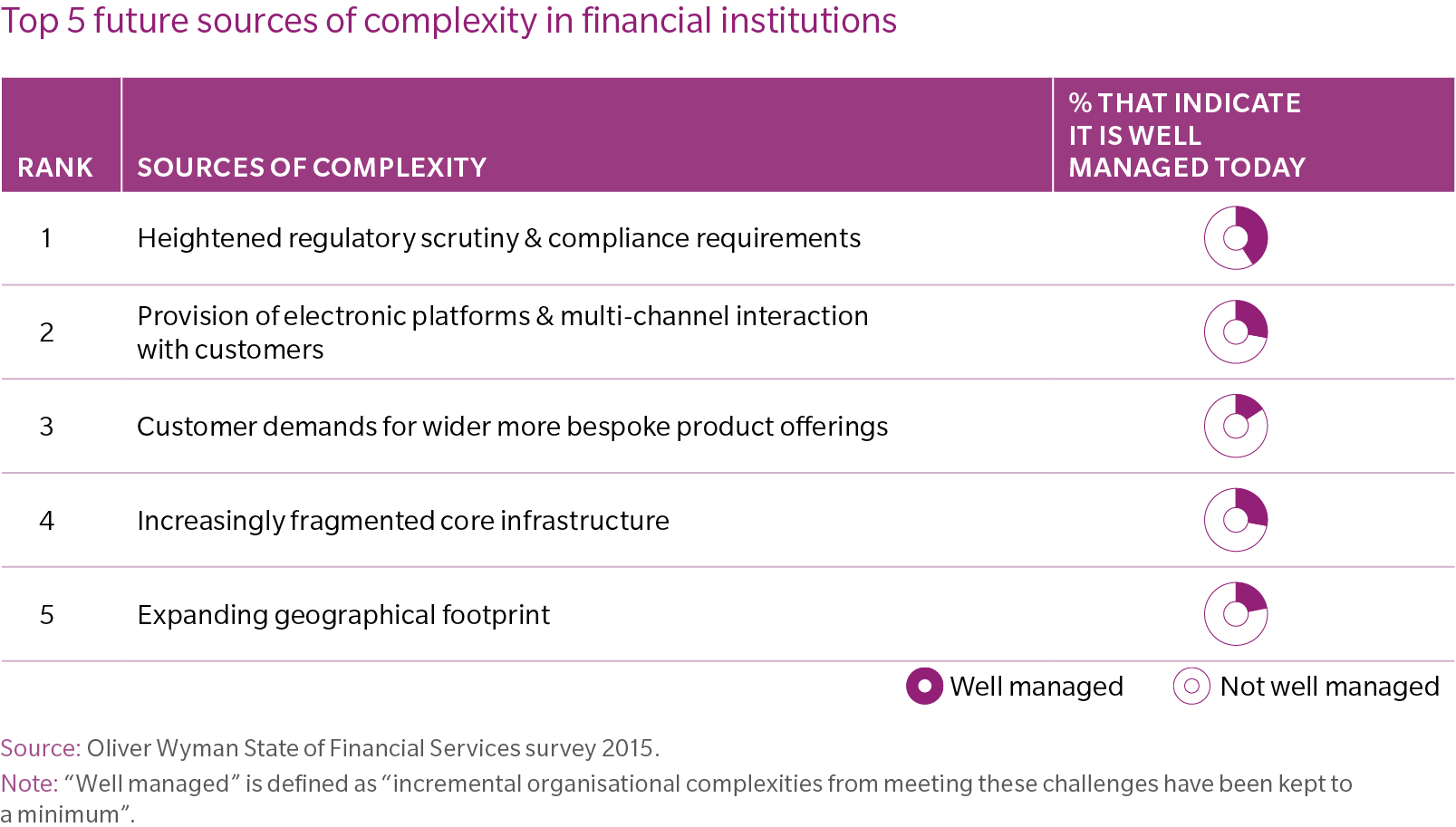 Five important sources of complexity for the industry are explored in the report: regulation, channel proliferation, systems fragmentation, product proliferation and geographic expansion.
