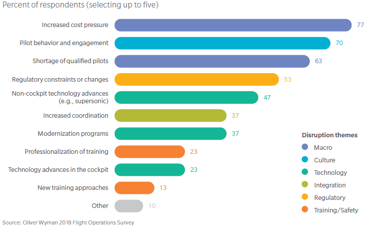 The impact of mega disruptors such as pilot shortages, regulatory constraints, and technology advancements like new supersonic aircraft, cockpit innovations, and fleet modernization
