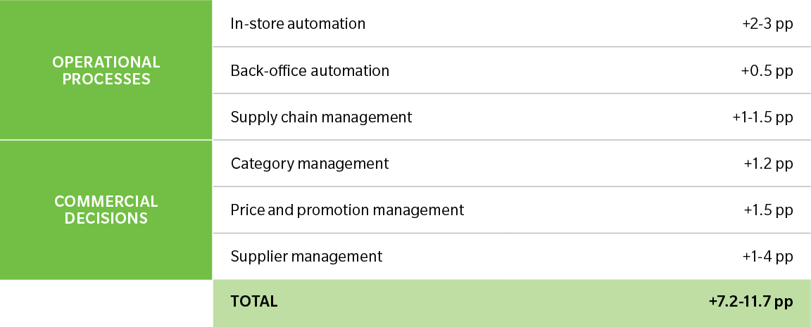 This advanced level of automation will drive a reduction in the headcount of entry-level accountants and other back-office staff, and also enable senior management to react faster to changing business conditions. As back offices at headquarters typically account for around 1 percent of a retailer’s costs, there is a high chance that AI can raise the company’s margin by 0.5 percentage points.