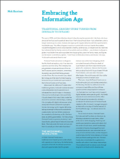 To cut costs in stores, Fictional Foods first reduced staff numbers at checkout, by allowing customers to scan items, either at the exit or while shopping. Ordering and warehouse operations were automated. And the center of each store, which traditionally consisted of stacks of packaged food and household products, was converted into an array of icons and barcodes, so that shoppers could simply click for home delivery or to have their purchases waiting at the exit. Fictional Foods also consolidated its suppliers to a handful with which it had deep relationships. This enabled it both to reduce costs through long-term contracts and to develop new products jointly. Within a few years, Fictional Foods had cut its retail prices by an average of about 10 percent.