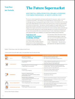 While the most visible changes to supermarkets will be these new customerfacing features, digital tools will transform operations in less obvious ways. Before customers arrive in a store, they will have assembled their shopping lists using online apps informed by artificial intelligence, which could recognize their consumption patterns. As they sample products in-store, they will flip through recipes on a tablet or smartphone and make online orders for home delivery or for picking up as they leave the store.