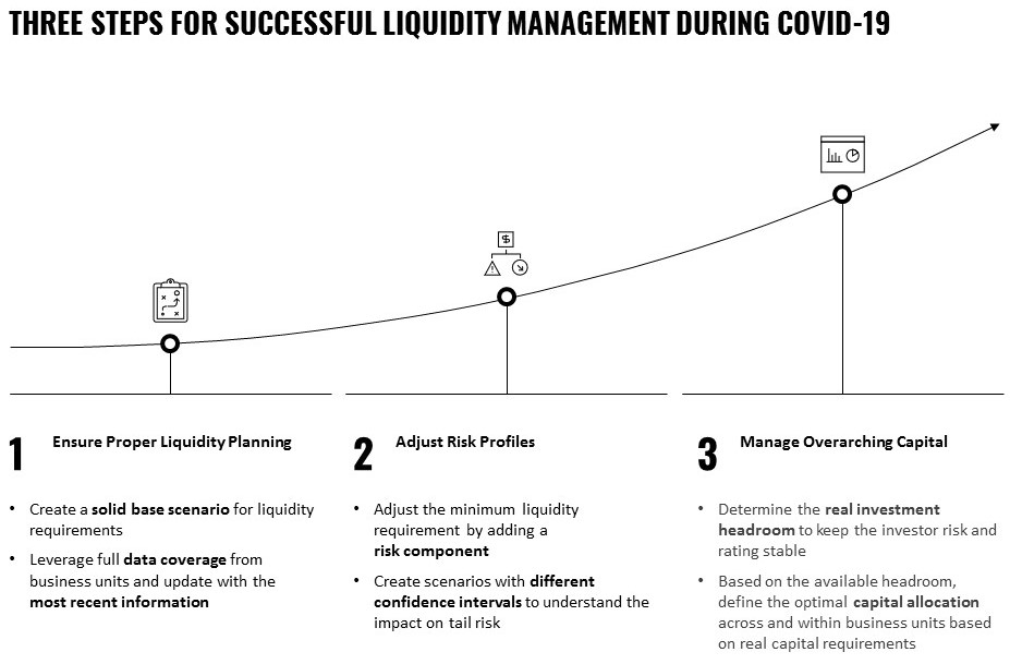 As a result of differing priorities for the short-term in comparison to the medium- and long-term, downside risk prevention and rating covenants may become more important than potential profit maximization. To account for this, capital requirements need to be revisited from a portfolio perspective to determine factors such as which capital requirements are likely to be influenced and which non-essential activities can be put on hold. Furthermore, considering which activities do not contribute to liquidity improvement in the interim, yet are essential to future growth, is key.