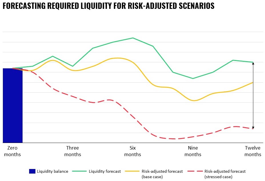 To overcome this, companies should begin by identifying external drivers associated with the COVID-19 crisis—which include remote work needs and governmental restrictions—and their relation to the individual liquidity balance. Once the qualitative impact has been taken into account, measuring the quantitative impact of external drivers on liquidity balance is necessary. While the long-term impact of the pandemic is ultimately yet to be defined, companies can simulate different stress test scenarios as a function of external drivers.