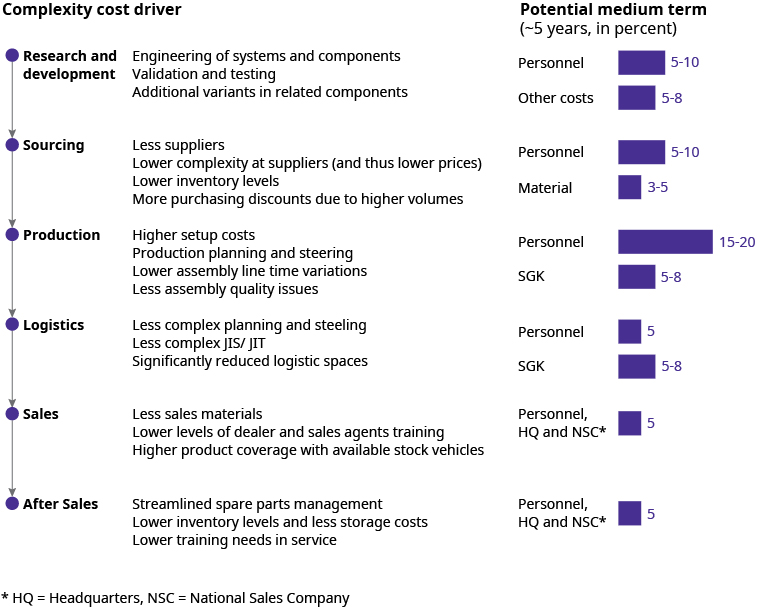 In another case example, an OEM introduced a top-line engine for a mid-segment model based on an incomplete view. Taking a deeper look, the analysis showed that about 75 percent of costs for that additional variant were omitted in considerations, including items such as prototypes, pre-series, logistics, and production spaces.
