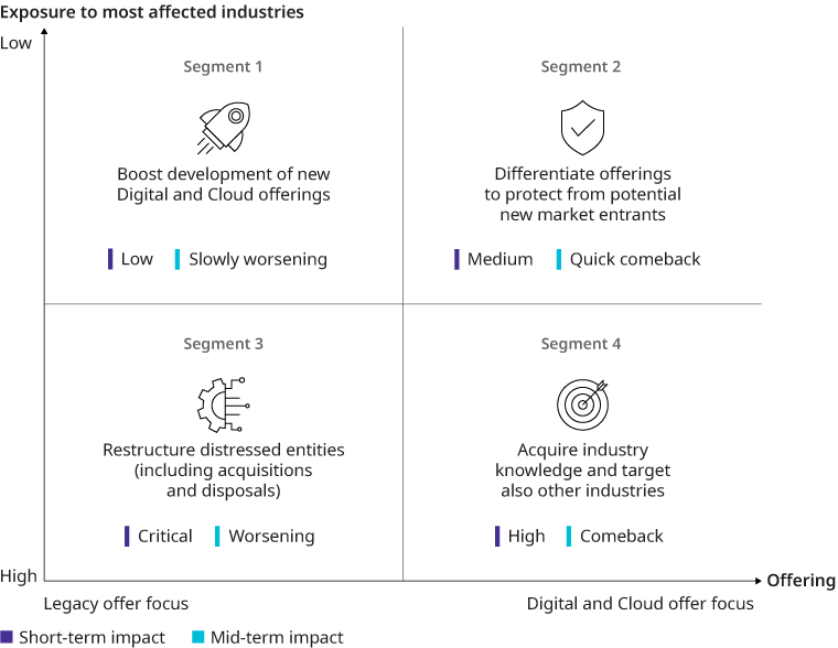 Consequentially, IT services spend has taken a major hit. Within this downturn, our analysis shows client scope to be a major factor. IT services providers serving industries less affected by the pandemic (e.g., telecommunication, pharma) are more resilient, while exposure to discretionary spend in more critically affected segments (e.g., travel and leisure, automotive) creates a larger challenge.