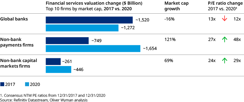 Wholesale banking businesses get a lower multiple from investors than adjacent non-bank players. A large part of this valuation gap can be explained by how these firms are assessed – with non-banks valued for fast revenue growth while banks are valued for earnings and returns – and by the regulatory capital requirements that impact banks.