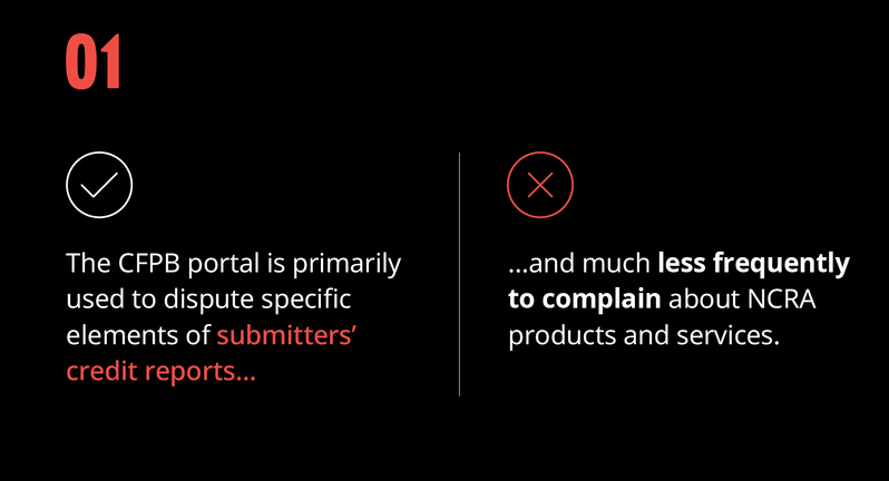 Oliver Wyman is analyzing credit reporting submissions (See note 1) made against the Nationwide Credit Reporting Agencies (NCRAs) (See note 2) via the Consumer Financial Protection Bureau (CFPB) online portal. The CFPB created the online portal to “help consumers connect with financial companies to understand issues, fix errors, and get direct responses about problems” (See note 3).