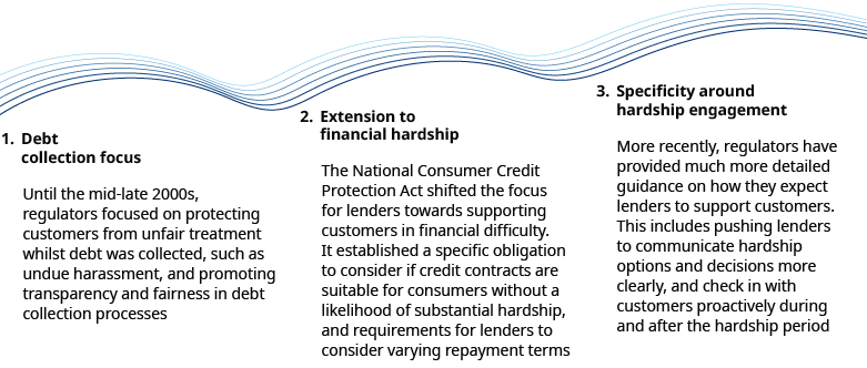 Australian regulators have implemented three waves of reform in how they expect lenders to treat customers facing financial hardship, with an increasing emphasis on customer wellbeing over time. Regulatory focus has shifted from debt collection, to defining when (and for whom) the hardship assessment process should happen, to being more specific about how lenders support customers and engage with them during and post-hardship.