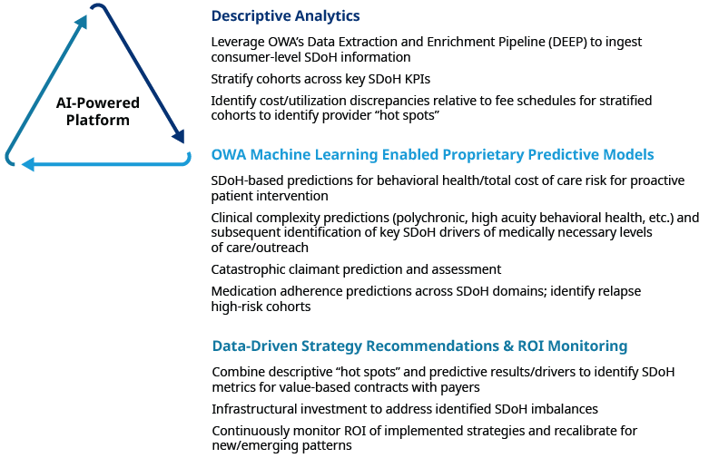Through our partnership with HealthWise Data, Oliver Wyman has developed a three-pronged approach for assisting provider systems in leveraging the power of SDoH to transform care for their patients. Our platform ingests data on enrollment, claims, and member engagement with provider system and SDoH, and conducts a rapid assessment by running the data through our machine-learning-enabled data extraction and enrichment pipeline. The infographic below illustrates our approach: