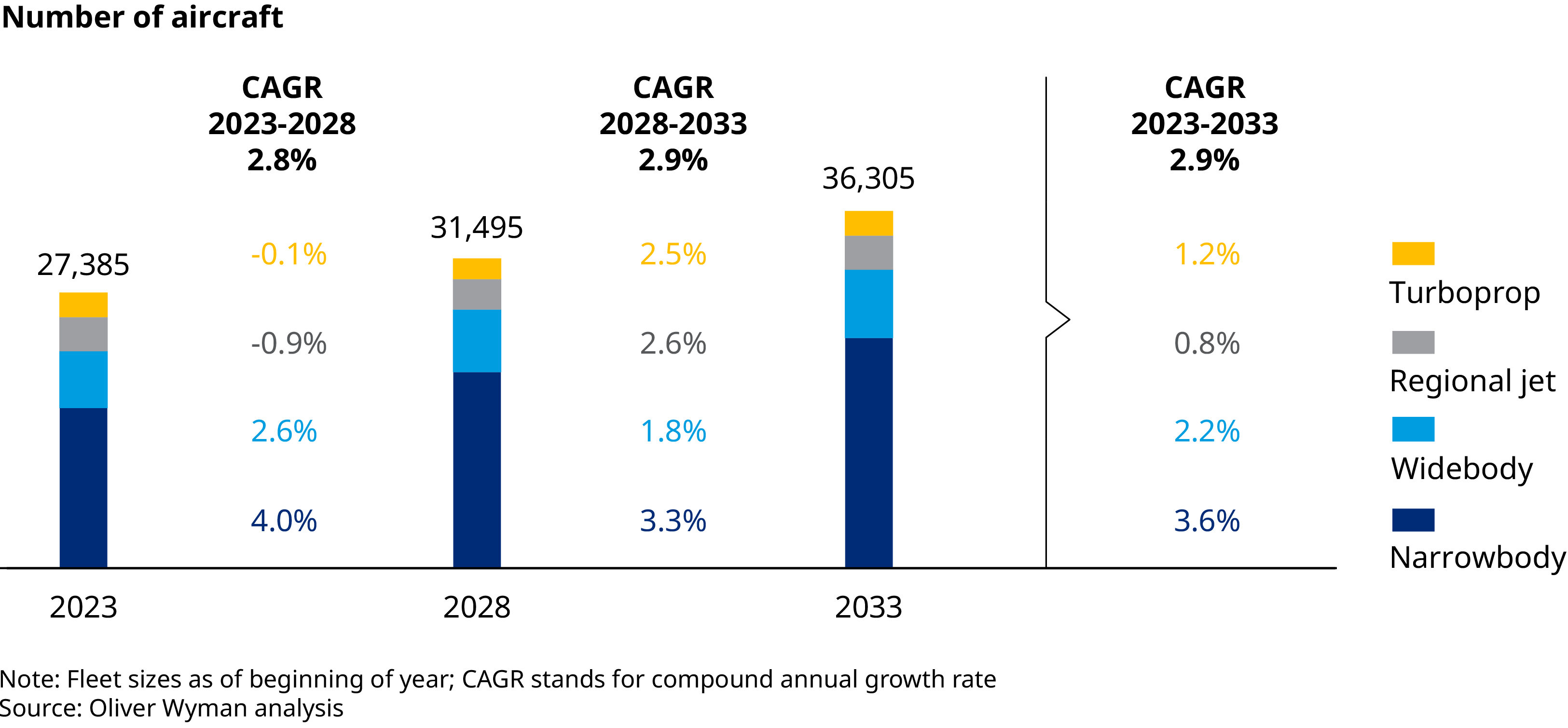 The worldwide commercial aviation fleet will expand 33% to over 36,000 aircraft by 2033 — a compound annual growth rate of 2.9% — according to Oliver Wyman’s Global Fleet and MRO Market Forecast 2023-2033. Today the fleet numbers almost 27,400, just short of its size in January 2020 — the last month before COVID-19 changed the economy and everyday lives around the globe.