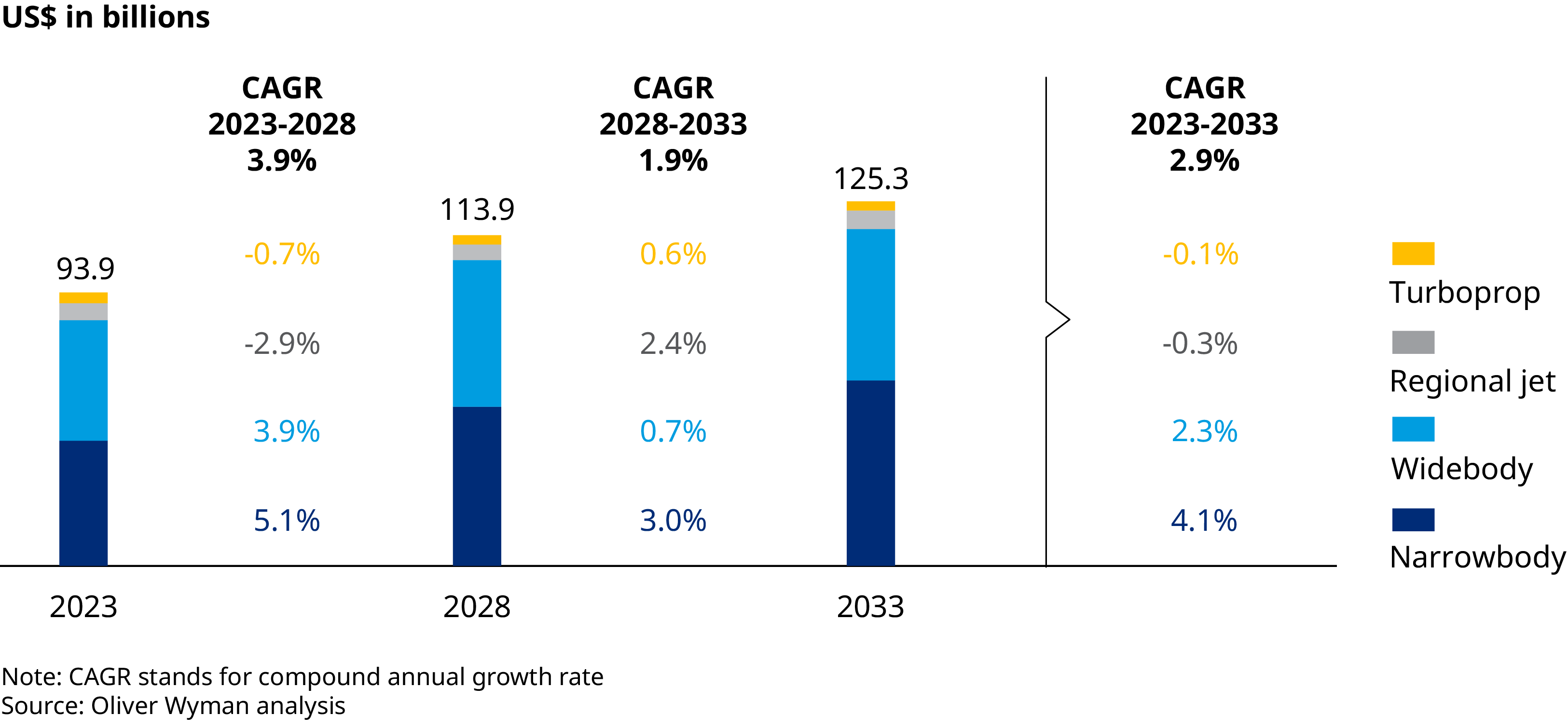 The increase in the size of the fleet is fueling demand for MRO as well. Engine MRO has historically represented the biggest piece of the MRO market and remains so today. In 2023, engine MRO is expected to exceed 2019 levels, helping the overall MRO market to rebound. This recovery comes a year earlier than previously forecast because of the rapid return of air travel demand and utilization. Over the forecast period, engine MRO is expected to hit $63 billion by 2033, representing compound annual growth of 4%.