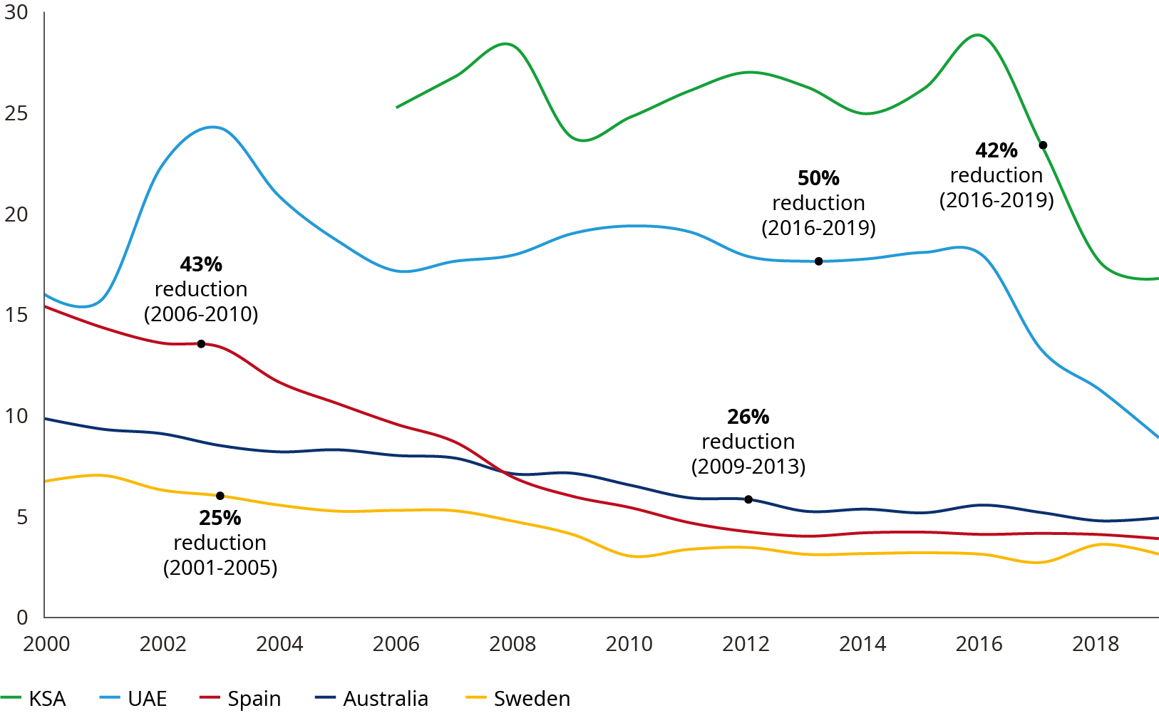This group refers to nations with fatalities of more than 10 per 100,000 inhabitants. From our perspective, these nations should aim for programs that secure short-term, aggressive reductions in deaths and severe injuries. Examples of effective strategies were those implemented by the UAE and the Kingdom of Saudi Arabia. Both jurisdictions had high initial fatality rates (above 25 at their peak) and achieved a more than 50% reduction in just a few years.
