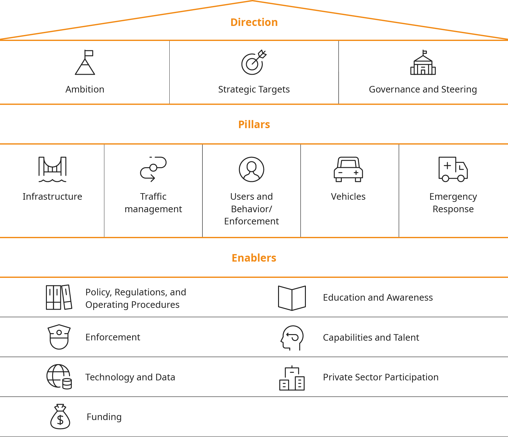 By analyzing the policies and initiatives of 25 public and private sector leaders, our team of experts identified 15 building blocks for a world-class traffic safety approach. These are structured into the categories of direction, pillars, and enablers.