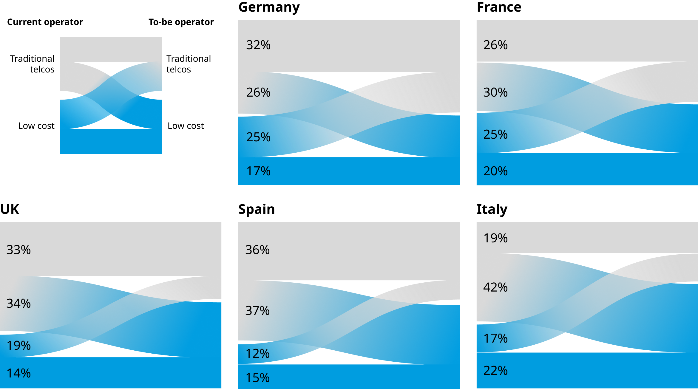France tells a different story. Here, traditional operators face a progressive erosion of market shares, with 56% of intentional churners presently aligning with them. More than half of these consumers are inclined to switch to a low-cost operator, indicating a significant shift in market dynamics.
