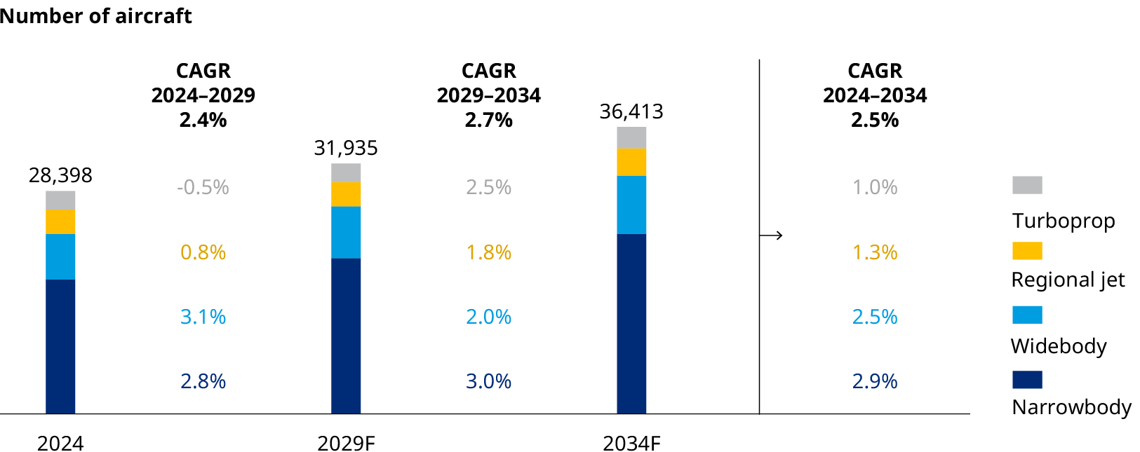 The other rapidly expanding fleet is in Eastern Europe — expanding 9.2% annually in the first five years and 7% over the 10 years. This is despite Russia’s inclusion in the regional numbers. Russia's fleet, the only major fleet to contract between 2024 and 2034, will shrink 8%, and because of the sanctions imposed after it invaded Ukraine, its narrowbody fleet will decrease by a stunning 44%.