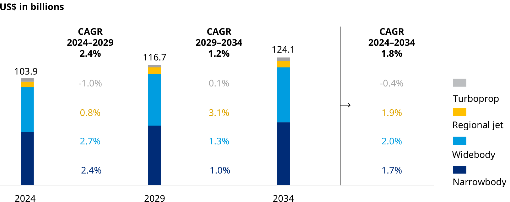 Meanwhile, reflecting that slower expansion, demand in the maintenance, repair, and overhaul (MRO) sector will grow 1.8% annually on average through 2034, when revenue will reach $124 billion. Our 2023-2033 forecast had the sector expanding at a 2.9% CAGR. In 2024, MRO revenue will rise almost 3% to $104 billion from $101 billion last year.