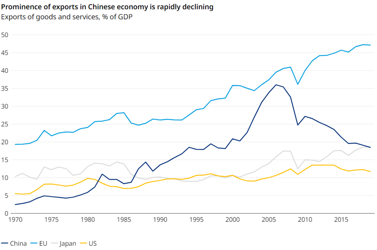 Recent events are also raising questions about companies’ continued dependence on China and its lengthy supply routes. The share of trade in China’s economy is on the decline, falling from a high of 35% before the financial crisis to less than 20% today (see Exhibit 1).
