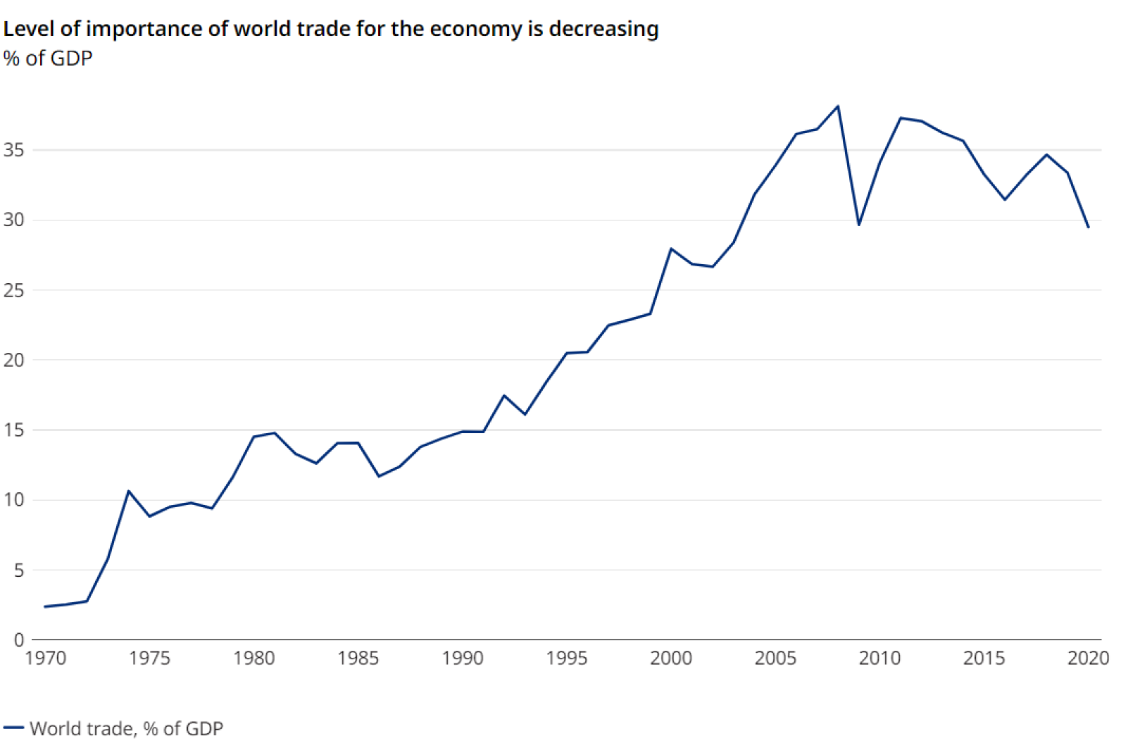 In his book, The World is Flat: A Brief History of the Twenty-First Century, Thomas L. Friedman describes how traditional sources of competitive advantage all but disappeared due to technological change, economic liberalization, and globalization. But the recent past looks increasingly like a golden age. Over the three decades from 1970–2000, global trade increased at a spectacular rate, more than doubling, to account for 60% of world GDP by the end of the century. Even in the US, which has historically been less dependent on international trade than most other countries, the share of trade in GDP grew to 61% by 2008.