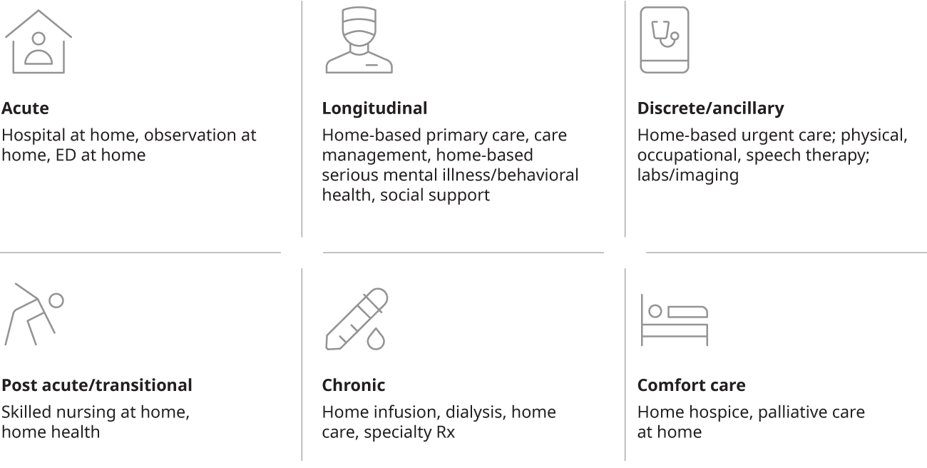 With hospital bed capacity stretched thin and expected to further deteriorate, the cost of new facility construction soaring, and an urgent need to improve outcomes and reduce the cost of care, healthcare leaders are seeing C@H as a long-term solution. Historically viewed as home health or skilled nursing care, the scope of C@H is expanding to include more care delivery models. Our latest report, Care at Home Today, examines the growing trend of C@H, which we define as physical, in-person care delivered directly to patients in their homes.