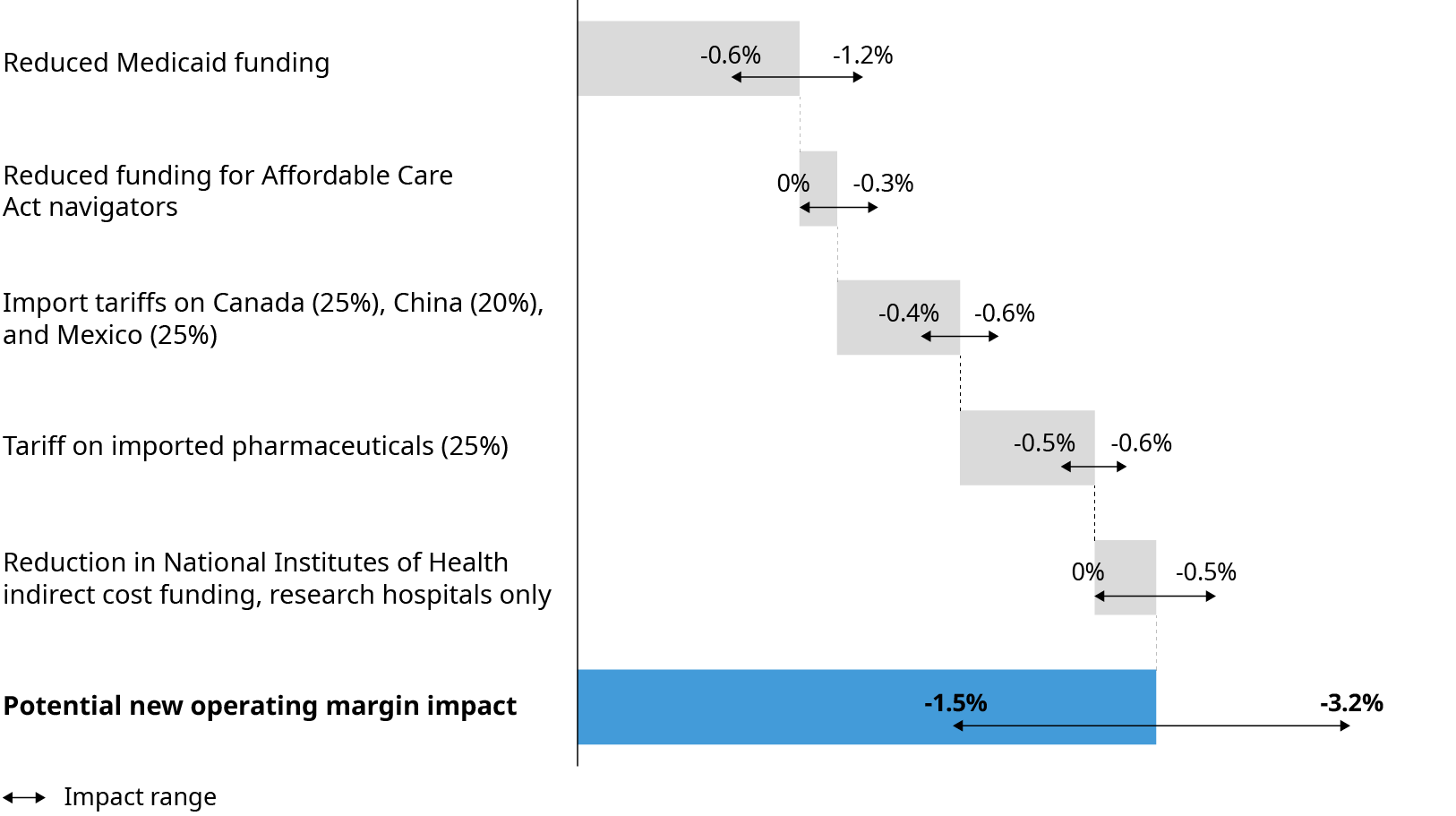 Tariffs on Canada, China, Mexico: 4% of total operating expenses are non-pharmacy supply costs that are impacted by tariffs on Canada (25%), China (20%), and Mexico (25%); general share of import to US from Canada (14%), China (14%), and Mexico(15%) applies and all tariffs are in effect. Cost of tariffs are fully passed on to health system purchasers. Lower impact scenario assumes 15% increase in non-pharmacy supply cost because of higher import expenses.